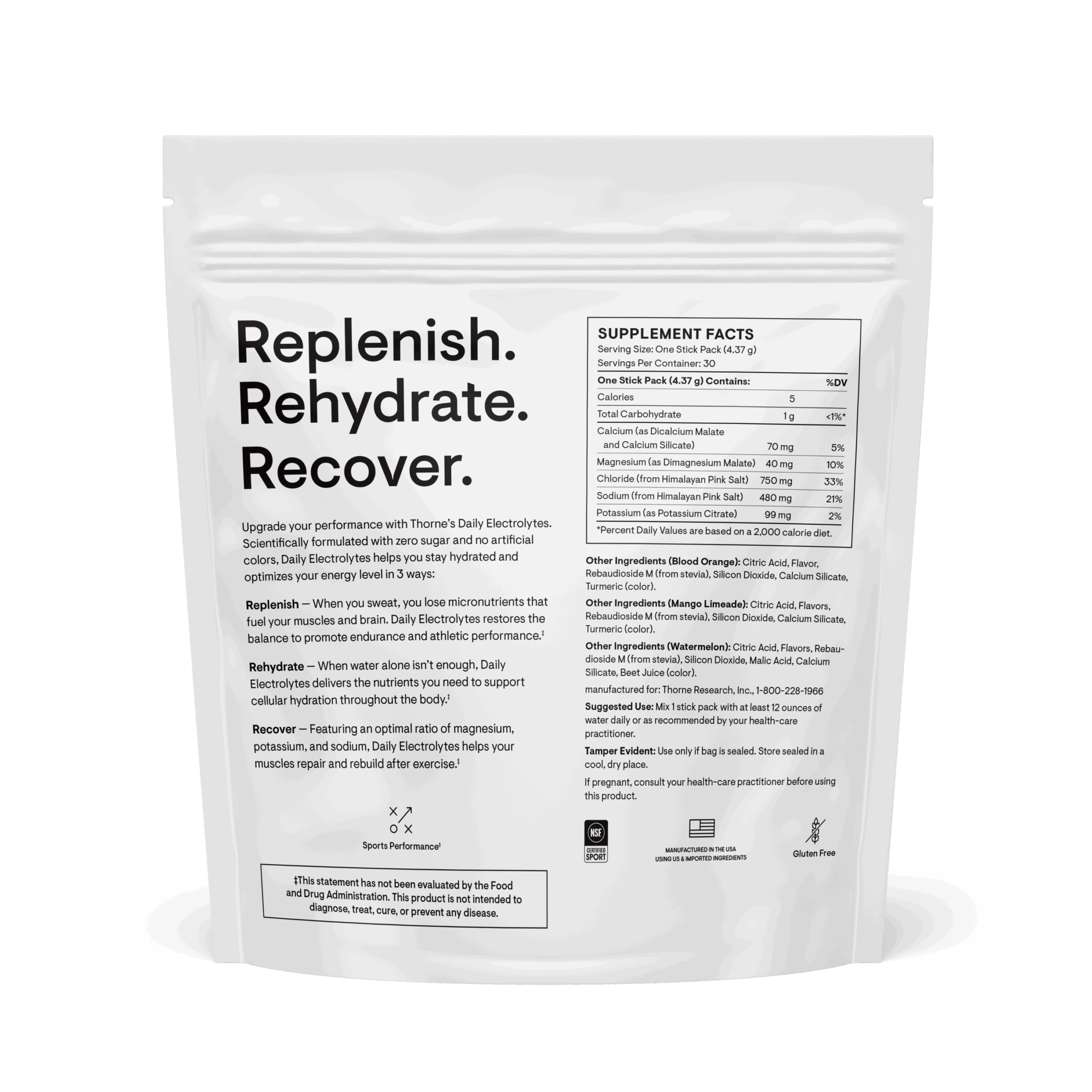 Promote healthy cellular hydration and boost recovery with Thorne’s Daily Electrolytes. Optimal cellular hydration and electrolyte balance supports cellular energy production, benefits cell signaling, and enhances muscle performance, helping you reach new heights, one sip at a time.* Because the body loses water and essential minerals through sweat – including sodium, potassium, magnesium, calcium, and chloride – replenishing those nutrients that are lost is an essential step to think, perform, and feel your best.* Daily Electrolytes are packaged in convenient stick packs to take with you to the gym, the great outdoors, or across the globe.*